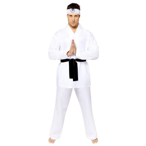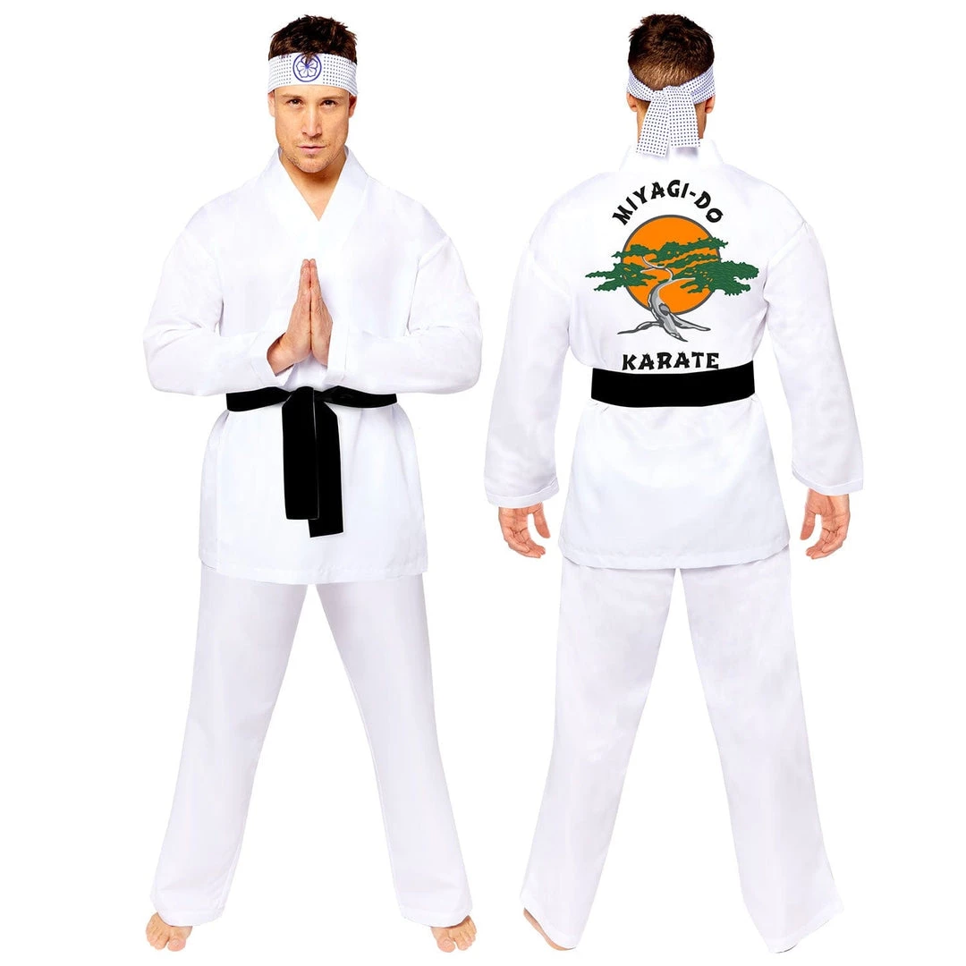 Wax on. Wax off. For a full dose of 1980s nostalgia, dress up in this Karate Kid costume for adults. From the Netflix series Cobra Kai is this licensed Miyagi Do Karate costume. Costume is white pants with matching white wrap around top with Miyagi Do Karate logo on back, black belt (of course) and iconic blue and white bandana like Mr Miyagi gave Daniel when they made their sacred pact.