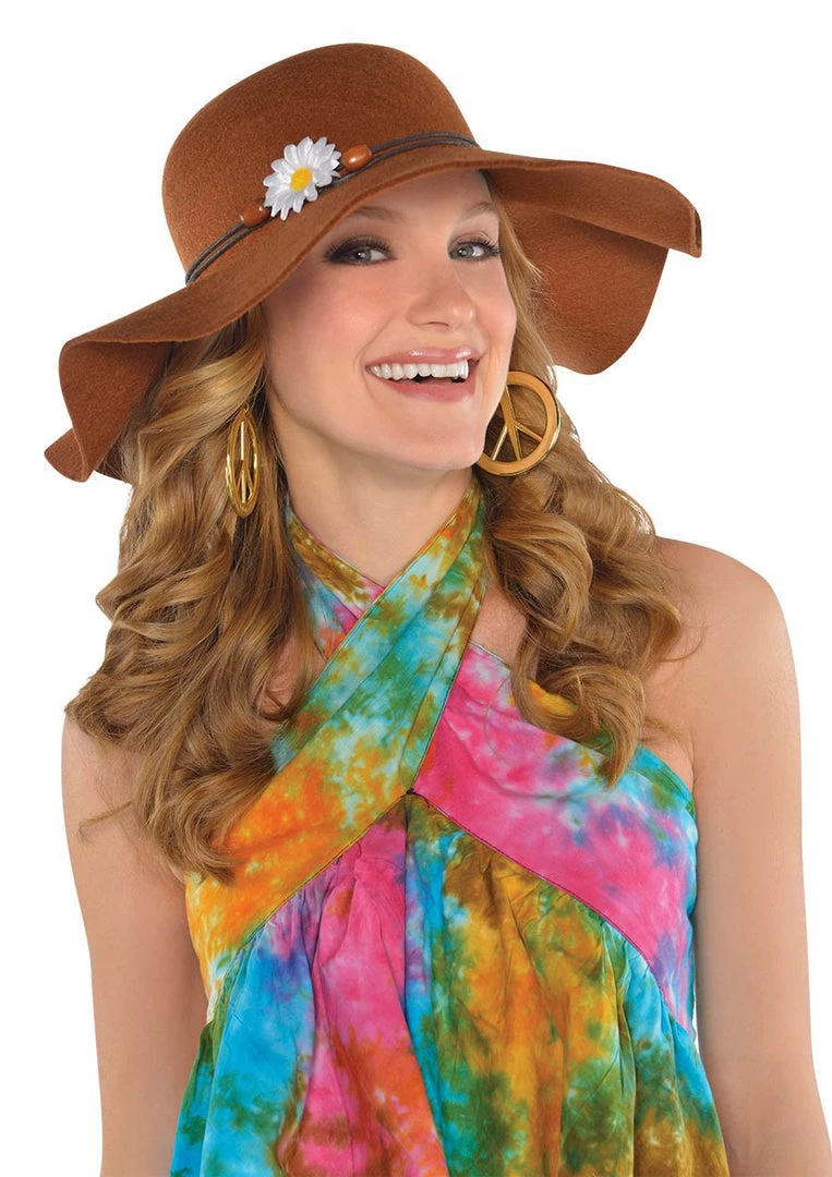 Join the Age of Aquarius and get groovy in this 60s hippy music festival floppy hat. Pretend like you’re back at Woodstock in this floppy brown felt hat with brown braid hatband with beads and daisy. Hat only. Unisex hat. Ladies wear it with this matching hippy dress, men wear it with this fringed vest. Don’t forget a peace sign. Groovy man.