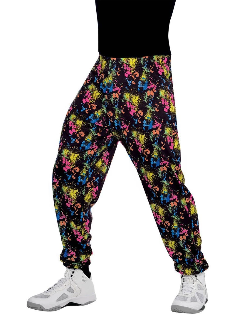 Break it on down in these totally 80s mens hip hop rapper pants. Black stretch waist parachute muscle pants with bright fluro coloured splatter print. Pants only. Mullet wig and all other items sold separately. BYO muscles or buy yourself a six pack and wear the pants with one of our Muscle T-Shrts.