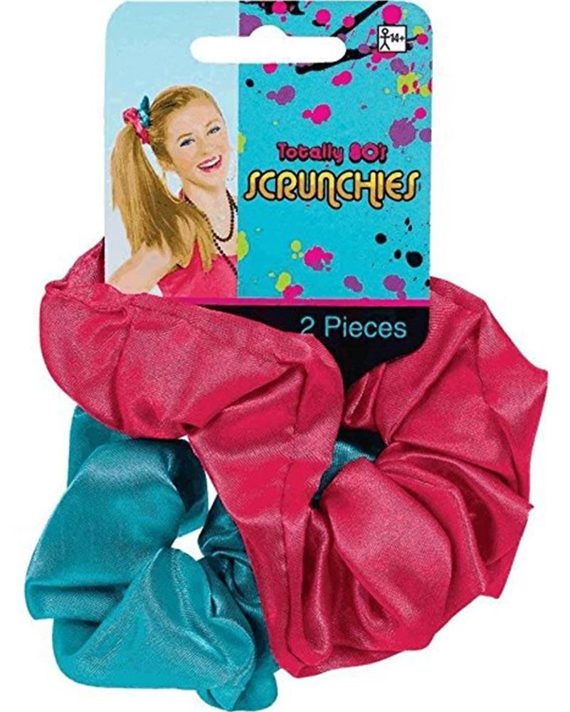 Bright and colourful, totally 80s hair scrunchies. Essential accessory to complete any 1980s retro costume look. Tie your hair high and wrap it up in a scrunchie just like it’s 1984. Like totally like. Scrunchie sets includes two scrunchies – one fuchsia and one teal. Awesome dude.