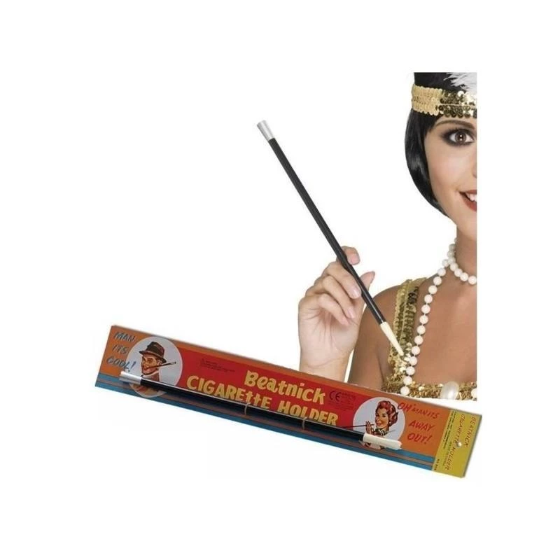 The always elegant looking cigarette holder was a fashion staple for ladies from the 1910’s to the 1970’s. Our plastic cream, black and silver cigarette holders are excellent for vintage looks from these eras and are nearly essential for 1920’s and Audrey Hepburn costumes.