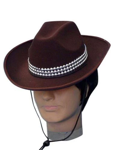 Brown felt cowboy hat with silver band and draw string for those windy days.