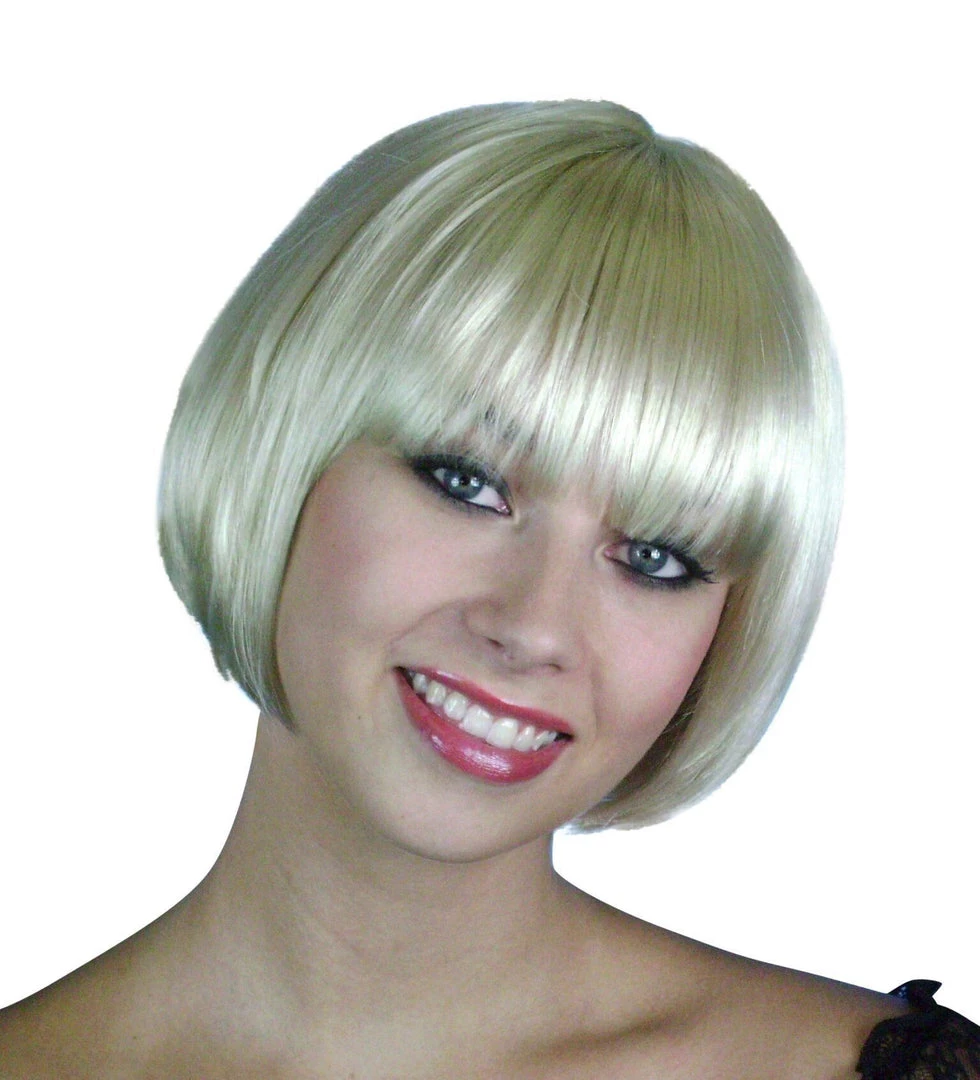 Deluxe high quality blonde bob wig in a china doll style. Very cute for a 1920’s flapper costume accessory.