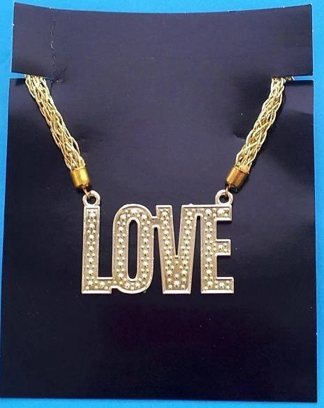 LOVE pvc necklace symbol attached to mesh fabric gold chain. The perfect accessory to make you feel 70’s hippy love vibes all over again.Â