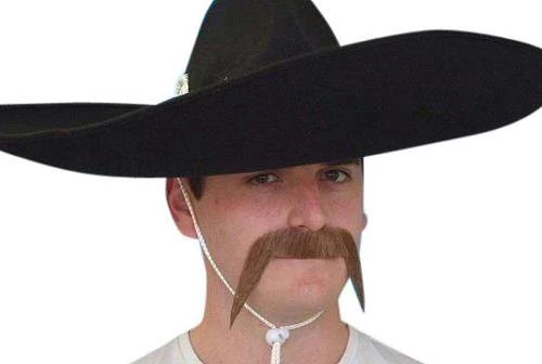 Realistic brown Mexican Western long handlebar costume moustache, great for Mexicans, Vikings, Cowboy, Bandit and Bikers. Includes, single use sticky tape. For professional multi-use we recommend to buy spirit gum.
