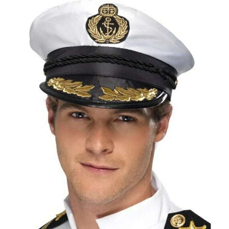 Shiny white satin captain’s cape navy nautical sailor hat with black visor. Great for nautical parties. A Sailor hat that makes you look like a true captain. Made of white satin fabric and got the black rope and embroidered gold anchor and leaves.