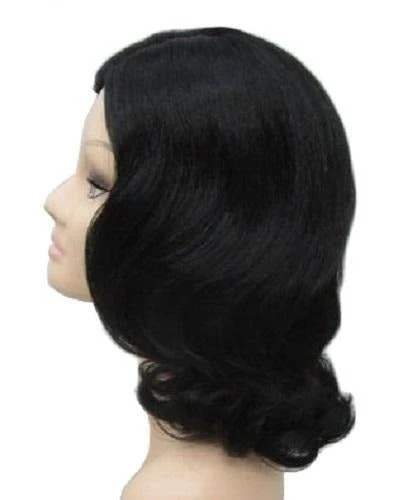 Mid-length black wavy 1920’s wig. Complete your roaring 20’s dress up look with this great side part costume wig with soft wavy curls.