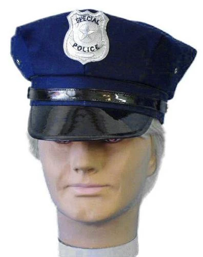 Costume police hat with black vinyl peck, blue cotton cover and silver fabric police badge