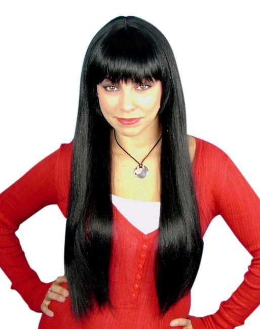 Long straight black female costume wig with fringe. Great as a saucy witches, Xena warrior princess and 1970’s fancy dress parties.