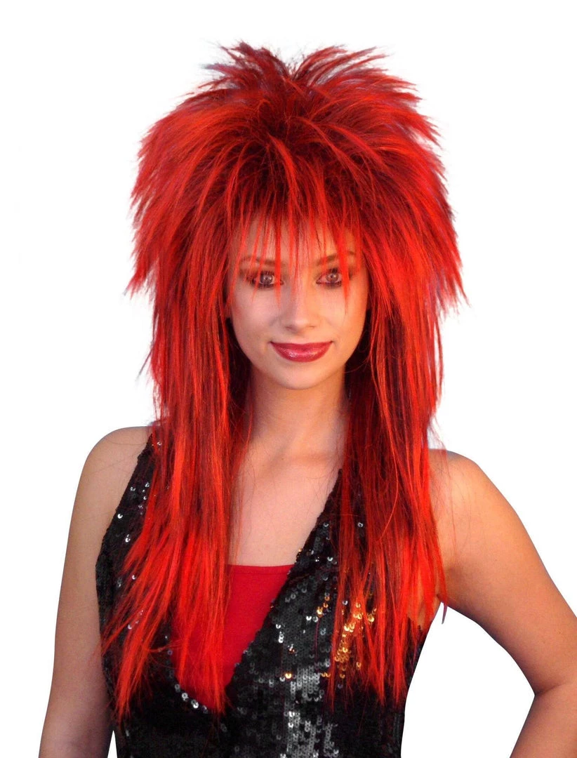 Spiky long mullet wig with red streaks. Great for 80s Cindy Lauper or any kind of punk rock gal!