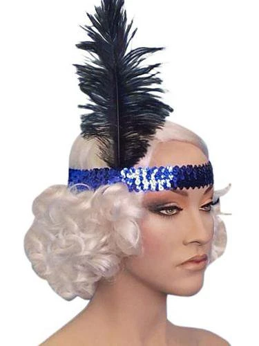 1920’s Blue sequin headband with black feather. Comfortable fit with elastic band!