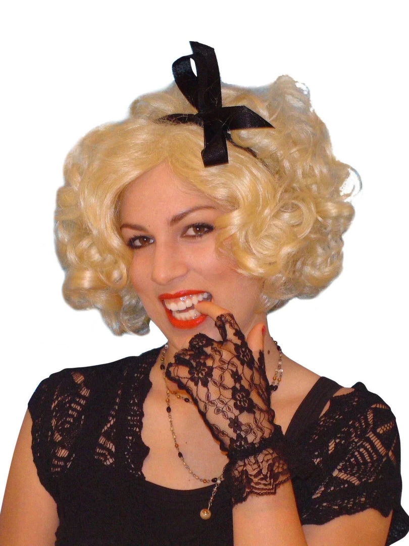 Short blonde wavy wig. Black ribbon included. We also sell a wide range of 80’s accessories, like lace finger-less gloves, fishnet stockings, braces and studded collars. This costume wig is perfect for a Madonna or Marilyn fancy dress up.