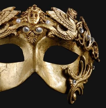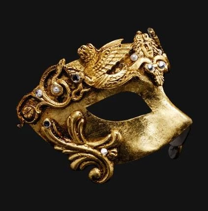 Handcrafted Papier Mâché gold eye mask with baroque inspired decorations featuring creatures from classical mythology. Secures with a black ribbon.