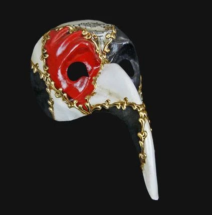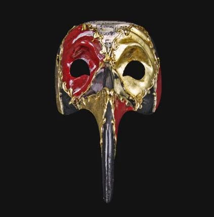This long nosed mask with a Harlequin and music pattern is a classic Venetian style. Choose between a black, red and gold colour scheme or a white, red and black colour scheme, both decorated with musical notation by Vivaldi. Handmade in Venice, Italy. Comes with certificate of authentication.