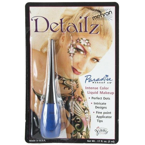Available here in Blue, Detailz is an intense colour liquid make-up that is designed for intricate body art. With its fine point applicator tip, it is perfect for creating tiny spots, perfect dots, fine lines, outlines, accents, highlights and many other little details! Available in black, silver, gold, red, purple, and green.