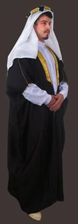 Long white djellaba, overgown in either black or white with gold trimming, headscarf, headpiece