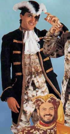 Costume consists of black jacket with gold trimming, maroon/gold knickerbockers & matching vest, lace jib.