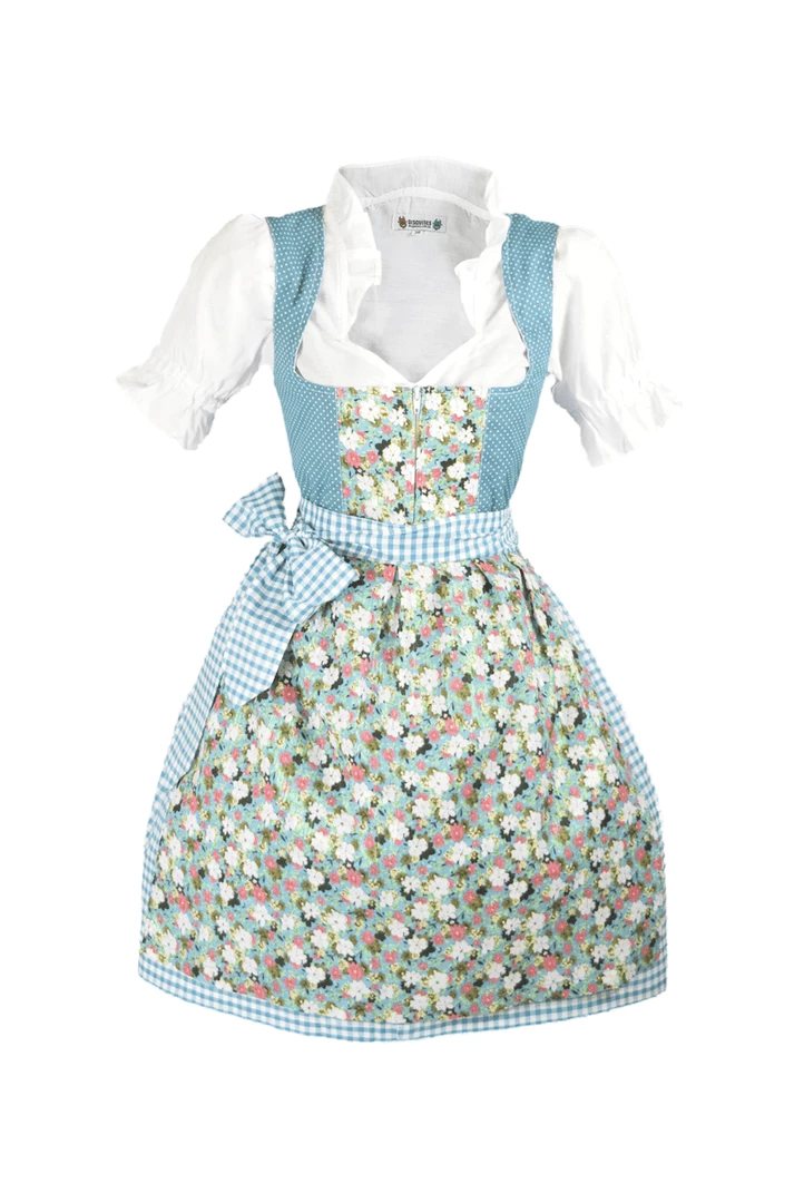 Delightful Oktoberfest Dirndl in turquoise with charming floral highlights. The Franzi Dirndl has been inspired by the sublime colours of an Alpine lake surrounded by a pasture of pretty wild flowers. This Traditional German Beer Girl Costume is a three piece costume which features the turquoise blue and white skirt with attached bodice in contrasting delicate turquoise print, featuring a pretty floral panel. The colours of the dress are set off by the sharp white peasant girl blouse and completed with the matching floral apron. The length is just short enough to be fun and playful without being too revealing, the classic Oktoberfest look.