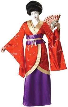 Geisha consists of undergown, floral brocade top coat with drop sleeves, waist sash & wig.