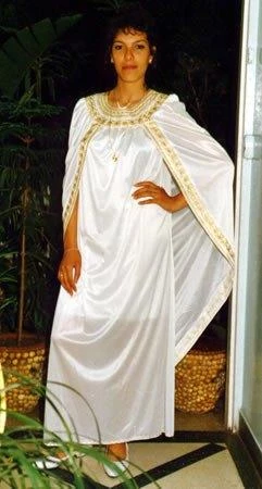 Long, creme coloured, sleeveless gown with attached cape with decorative gold trimming comes with a laurel for your hair.