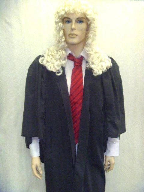 Academic gown and white wig, pictured here with tie and shirt.