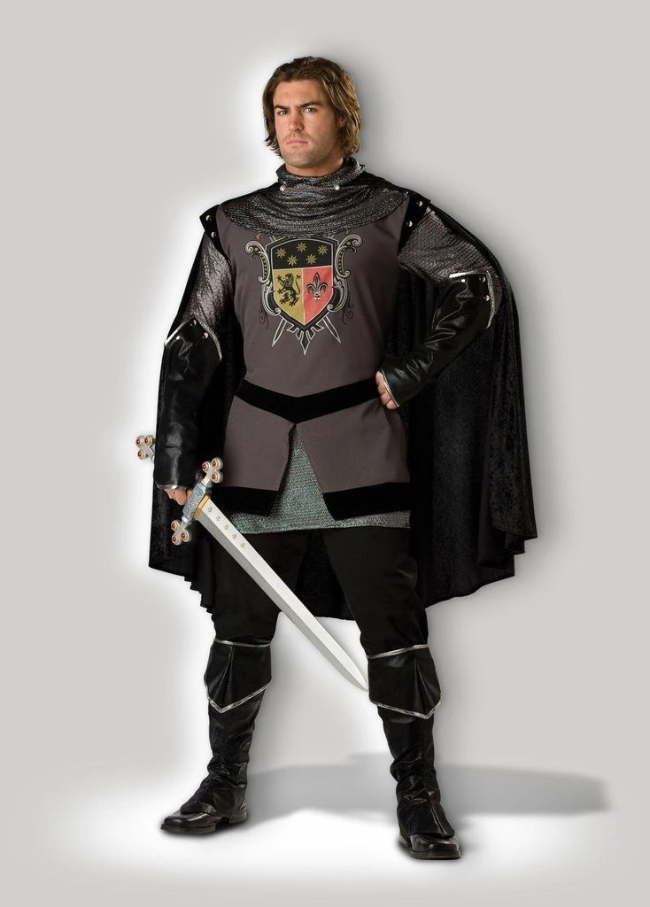 Gather at the round table noble knights of the realm in this Medieval fancy dress Dark Knight costume for men. Costume includes tunic with crest and chainmail style sleeves, matching chainmail cowl, black velvet cape. The perfect dress up for Medieval fairs and Game of Thrones themed parties. Large range of fake swords available for sale.