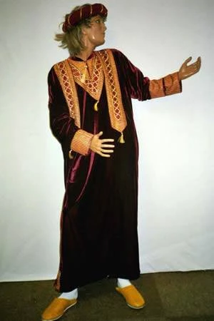 Black gown, overgown and headpiece all with gold brocade trim.
