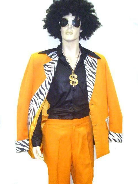 Orange jacket and flares with zebra print lapels and flare inlays.