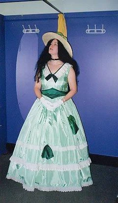 Green, full-hoop dress tied at back with big satin bow, black ringlet wig, hat, gloves