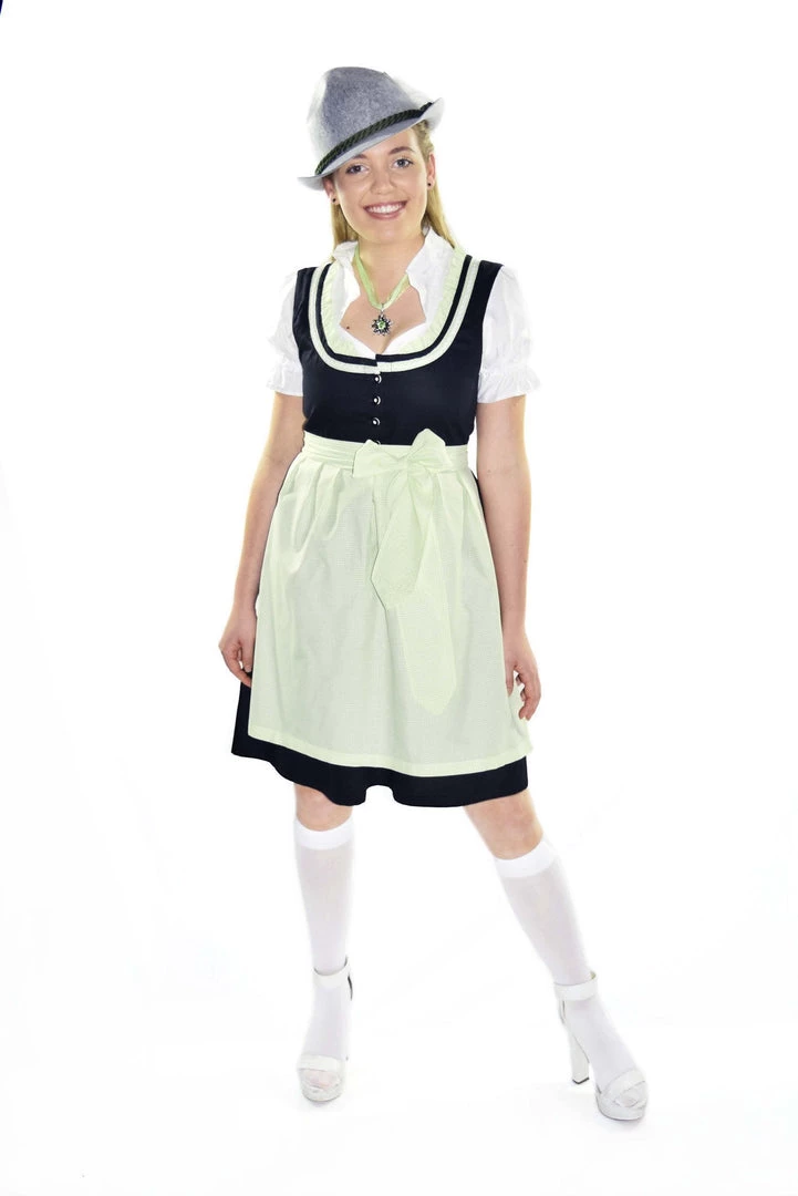 Beautiful traditional style German ladies Dirndl. Look like you’ve just stepped out of the Black Forest in this classic Oktoberfest outfit. Rustic Dirndl costume is a three piece costume which includes dark sage coloured dress which contrasts beautifully with the sharp white peasant girl blouse, set off by the baby green gingham apron. Dress bodice is embellished with matching gingham trim and rustic style buttons. Dress zips up the back.