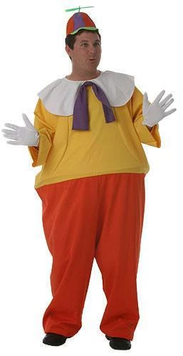 Exceptionally large yellow & orange jumpsuit with white collar & purple bow. Hat with propellor.