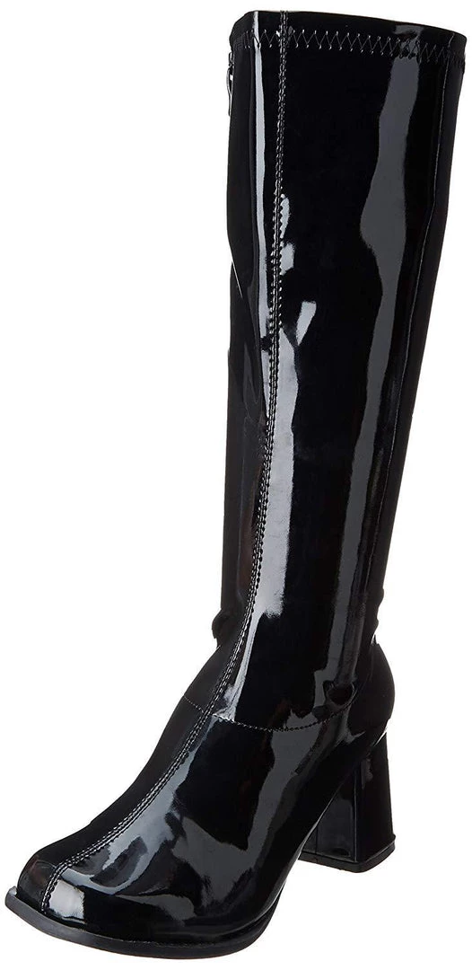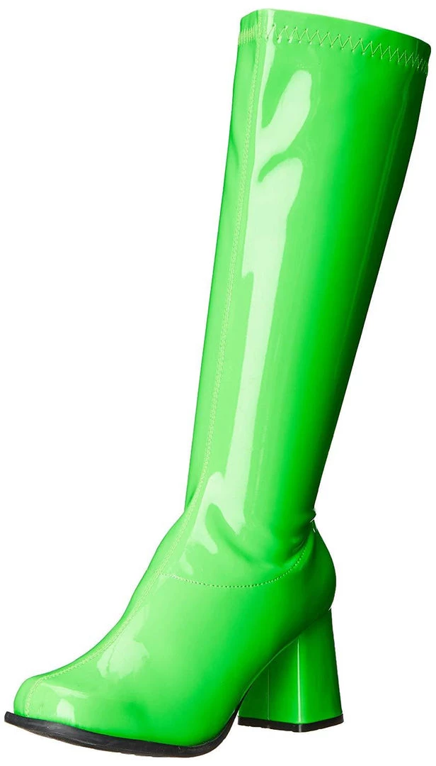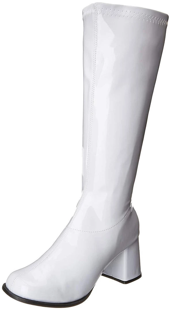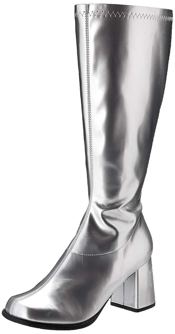 Hire these super groovy gogo boots to complete your 1960s or 1970s costume. These gogo boots have a slender calf fit and are available in white, fuchsia, red, lime, yellow, black, silver, ranging from ladies size 6 to size 11. Click here to hire Gogo Boots in a wider calf fitting, sizes 6 to 12. Our fun and funky boots are gloss vinyl and zip up the inside. The three inch square heel and round toe make these boots a more comfortable fit so you can dance the night away. Perfect for disco and Abba themes and also a perfect accessory to complete your superhero, space, Halloween, or practically any costume.