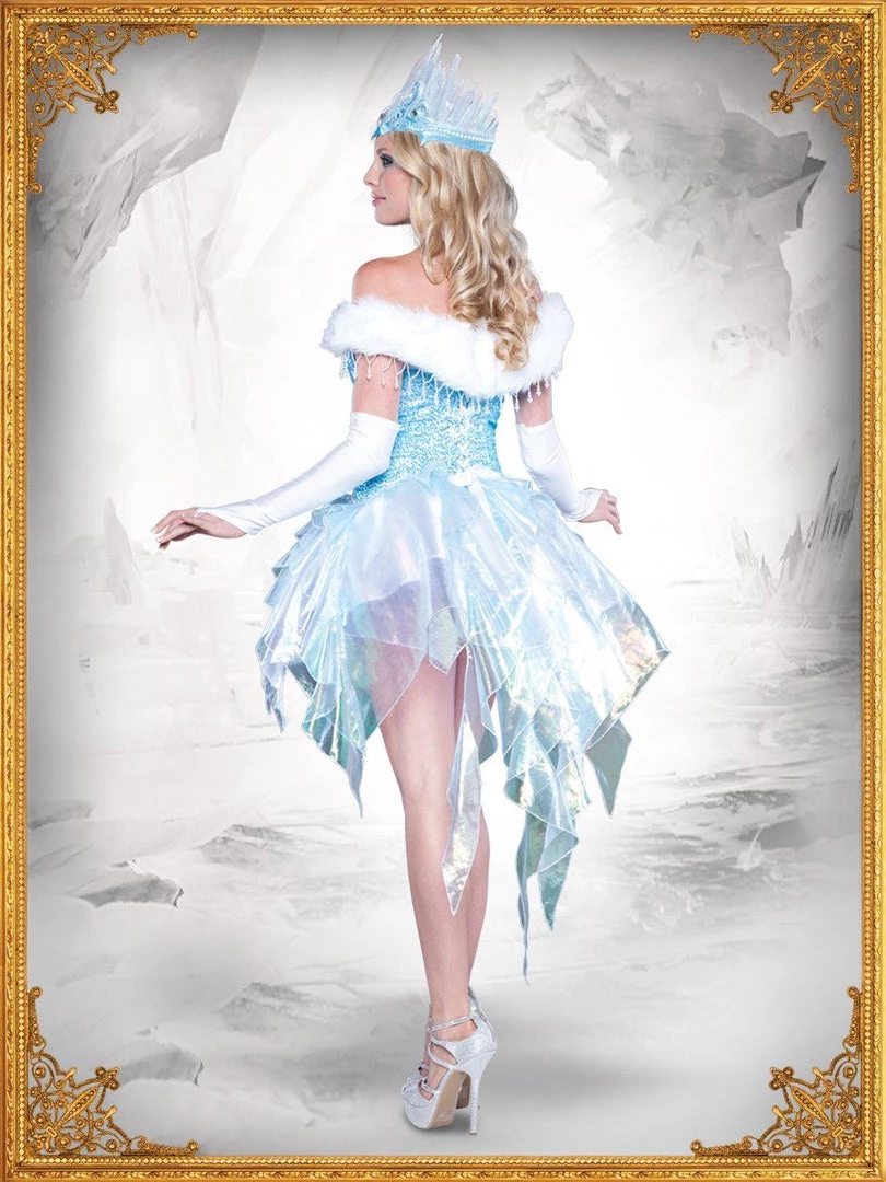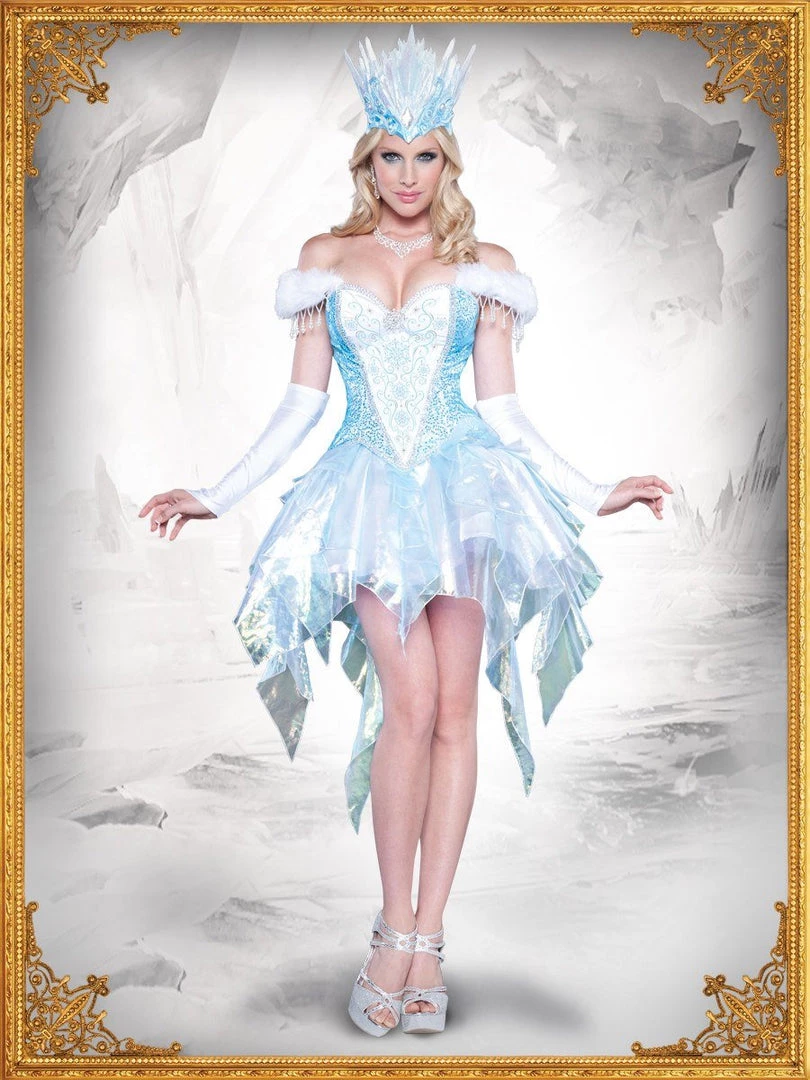 Inspired by the beautiful Snow Queen from Hans Christian Andersen’s classic fairy tale. This deluxe and luxurious costume from Costume Confidential, the Sexy Snow Queen costume includes sequin mesh and satin corset with boning and jewelled brooch, organdi skirt with attached petticoat, faux fur shawl with beaded trim, glovettes and vinyl crown with iridescent glitter and jewels. Jewellery not included. Can also take wig of your choice with costume.
