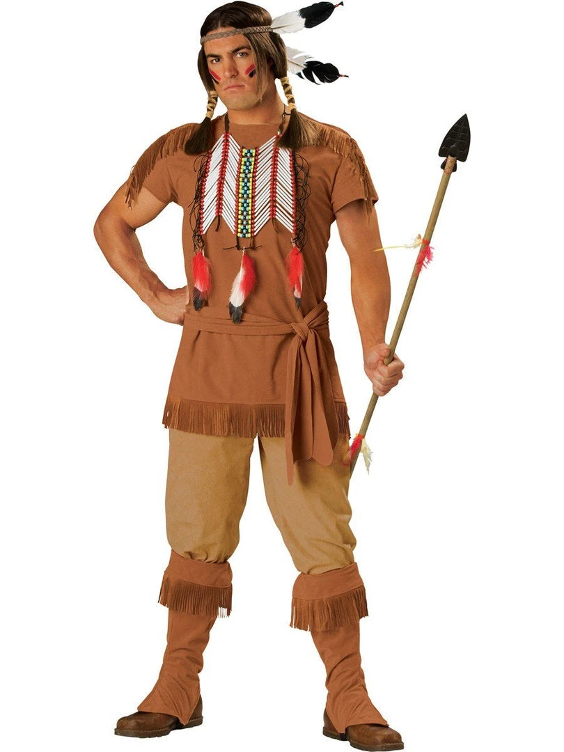 Indian Brave costume includes tunic with fringe details, pants, boot covers, waist sash, headpiece and beaded chest plate. Wigs also available with hire. Make-up and bow and arrow sets sold separately. Spear n/a.