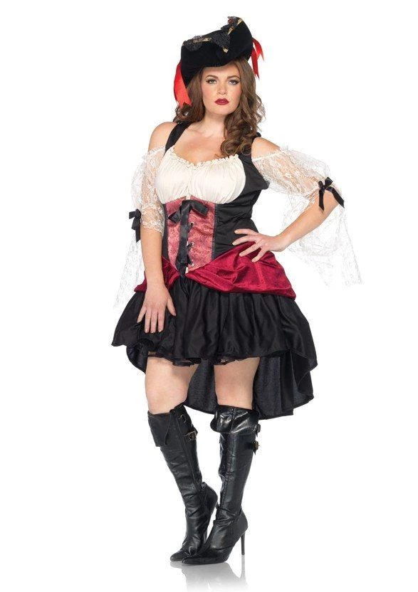 You’ll get up to a lot of fun in this wicked costume! This plus size pirate wench costume is a lace up dress in peasant style with sheer lace sleeves and hemline which is shorter at the front and longer at the back. Comes with hat. Other boots available at additional hire.Â