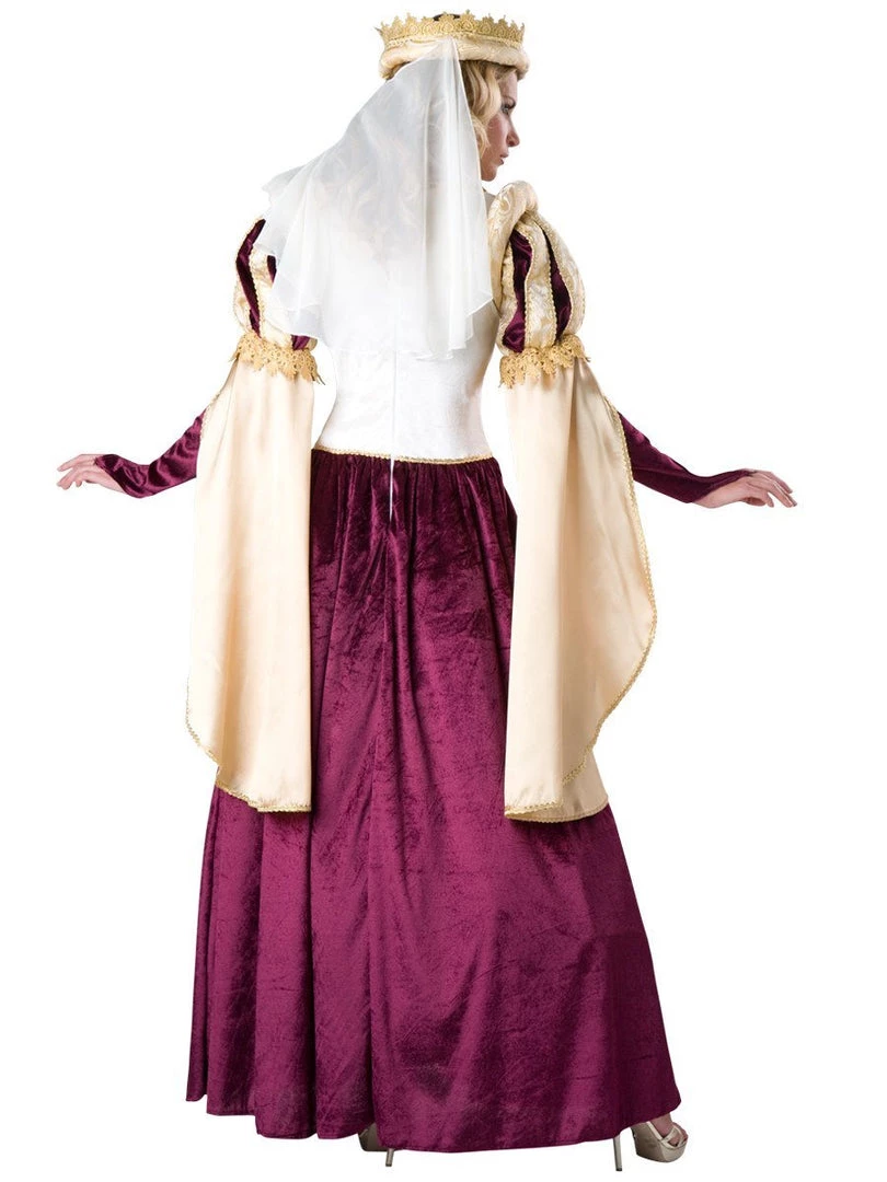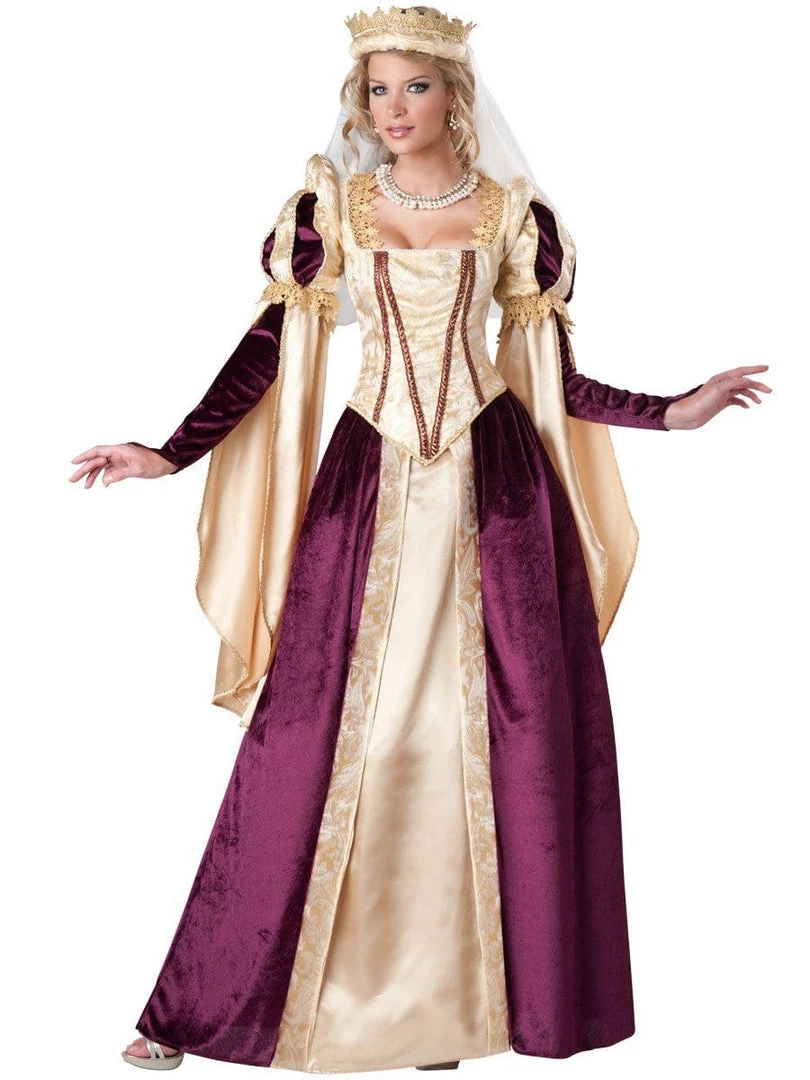 Lush and regal Medieval style ladies’ costume. Brocade, panne and satin dress with gold lace details. Long tulle petticoat for underneath and headpiece with gold lace trim and sheer veil. Jewellery not included. Perfect for playing the Game of Thrones as one of the conniving queens of  Kings Landing, like Cersei, Margaery or the indomitable Olenna Tyrell, Queen of Thorns. Gorgeous costume to wear to a medieval banquet.