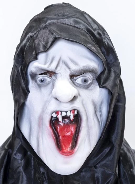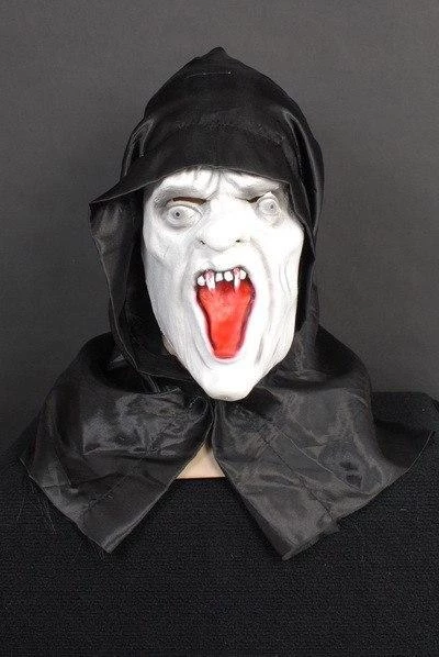 Dracula latex Halloween mask with black hood from original 1922 Nosferautu silent Dracula vampire horror movie.