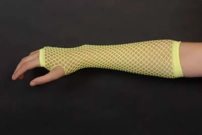 Yellow fingerless fishnet gloves with thumb and pinky holes. Great for Burlesque and 80’s looks.