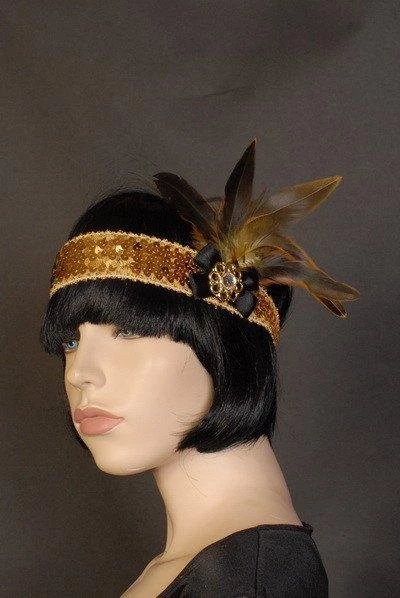 Embrace the rebellious opulence of the Flapper with our beautifully made Maya Lulu range of deluxe 1920’s headbands. This gold sequin headband with gold trim features a white gemstone with gold framing, black ribbon and black and gold brown feathers.