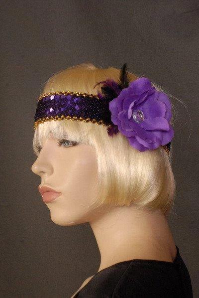 Embrace the rebellious opulence of the Flapper with our beautifully made Maya Lulu range of deluxe 1920’s headbands. This purple sequinned headband with gold trim features a purple flower with a silver gemstone centre, and purple and black feathers.