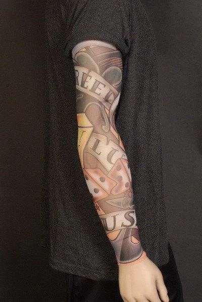 Realistic tattoo sleeve for one arm, themed for a 50’s greaser, featuring lettering and dice and clover motifs.