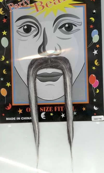Long grey felt stick on Chinese moustache. Includes, single use adhesive tape. For professional multi-use we recommend to buy spirit gum.