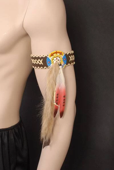 The perfect accessory to go with our Native American Indian Headdresses or as a centerpiece to your American Indian costume. The dark brown leather armband is fully adjustable, at each end are two leather strings that are held together with a bead that slides up and down to tighten on your arm. The armband is decorated with a crisscross design and a disc from which faux fur and two red feathers hang. This item is also available with tan feathers or blue feathers instead of red,