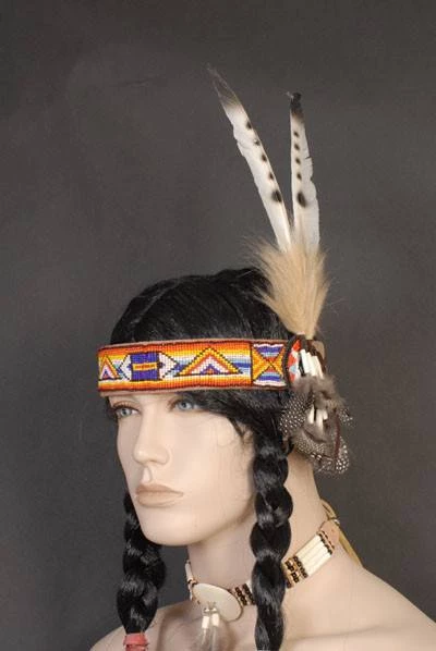Suede-look Native American Indian headband with two black tipped feathers with an elastic back for an easy fit. The forehead of the headband is embellished with a beaded design. Two 28 cm feathers fitted in faux fur and leather sit up from a beaded disc on one temple.