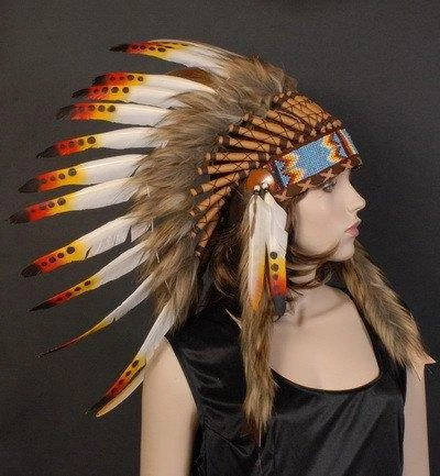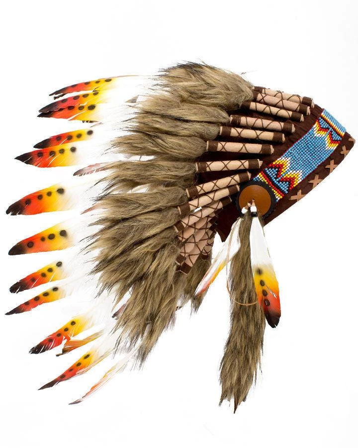 Smaller sized feathered American Indian Headdress with flame colored feathers. This headdress is a halo style war bonnet: it has a brown skull cap which is fully encircled by a series of 34cm white, yellow, orange, red and black feathers set in brown faux fur and faux leather, strung together to sit at an angle. The forehead is embellished with a beaded design with a set of brown discs at each temple. From the discs dangle feathers and faux fur tendrils that hang 33cm in length. Handmade and of exceptional quality, this is a standout fancy dress accessory for Western themed events and music festivals, or simply as something lovely to own.