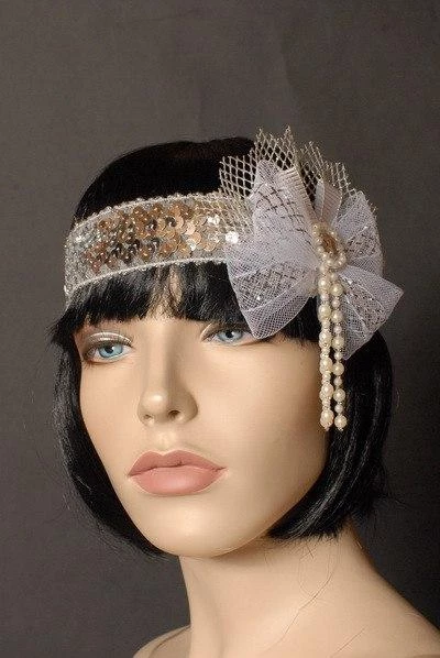 Embrace the rebellious opulence of the Flapper with our beautifully made range of deluxe 1920’s headbands. This silver sequinned headband with silver trim features clear gem framed by white pearls, and silver netting and ribbon.