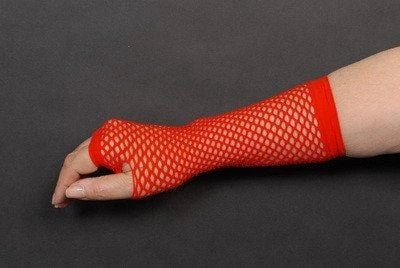 Red fingerless fishnet gloves with thumb and pinky holes. Great for Burlesque and 80’s looks. Also a cooler option for 1920’s Flappers in this Queensland weather.