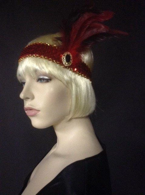 Embrace the rebellious opulence of the Flapper with our beautifully made range of deluxe 1920’s headbands. This red sequined headband with gold trim features a black gemstone with gold framing and red feathers with black tips.