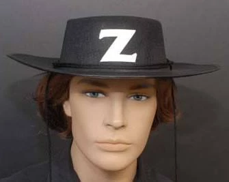 Zorro Hat: flat top wide brim black felt-ex hat, size of 57 cm, decorated with a Z for Zorro! Also Zorro masks, capes, foils