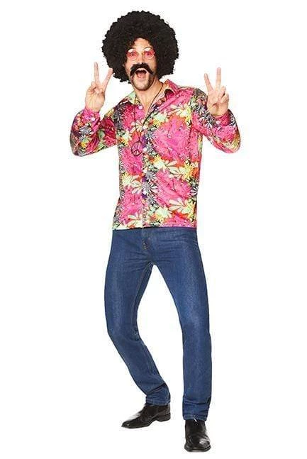 Peace, love and harmony man. Chill out in your groovy 1960s style Flower Power shirt. Perfect shirt for your hippie psychedelic costume. Complete your outfit with flares, wig, glasses and peace sign. Shirt is brightly printed floral design in stretch fabric.